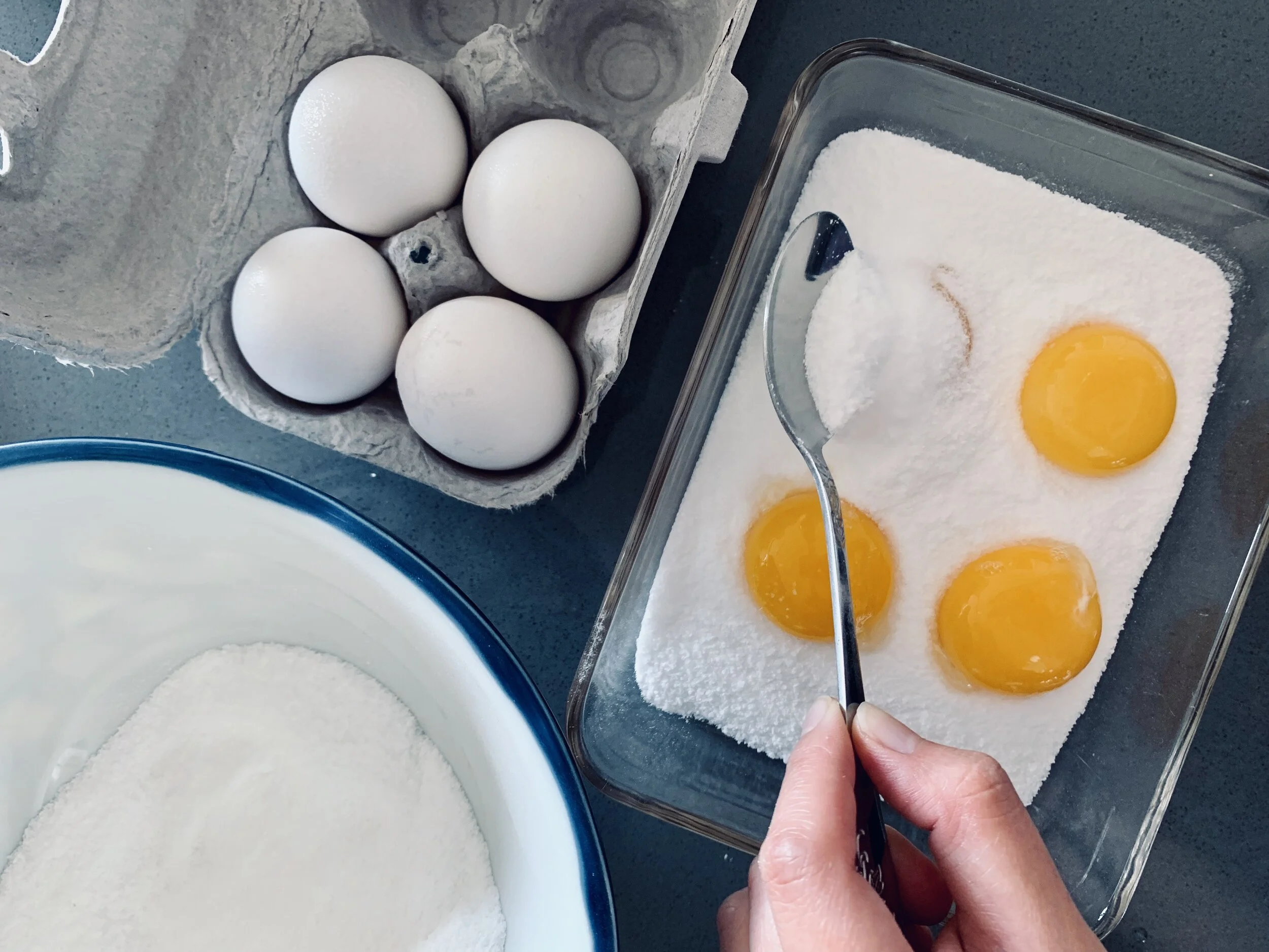 Use the remaining salt-sugar mixture to completely cover the egg yolks.