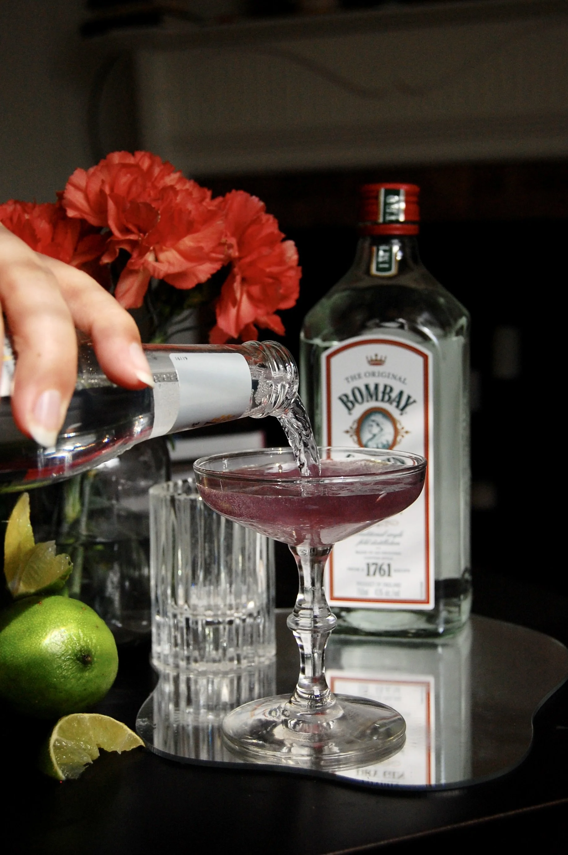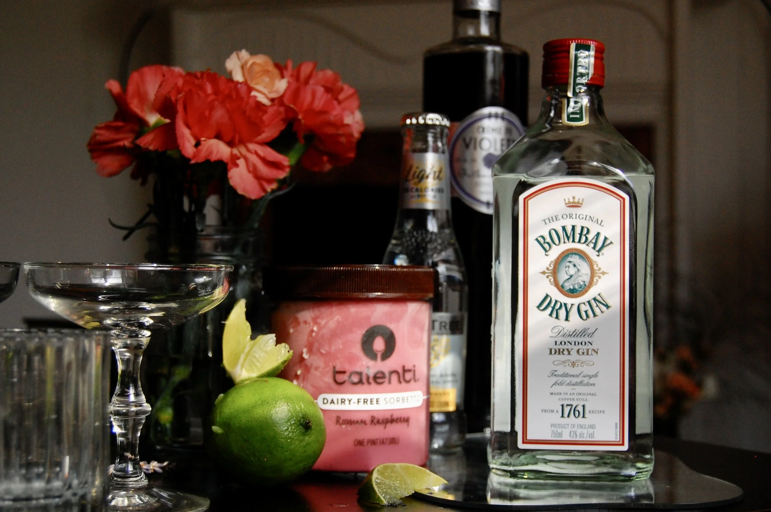 Add the gin, crème de violette, and squeeze of lime to a shaker, and shake. Pour into your class of choice, I went with a coupe glass. Next add a splash of tonic water based on how strong you like your cocktails. Finally, adding a scoop of raspberry turns this drink from a cool purple to a deep magenta and creates a little fizz.