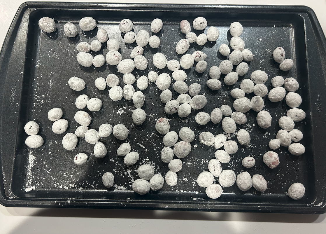 7. Using a spoon, shake off any excess powdered sugar and place the berries onto a clean sheet pan.