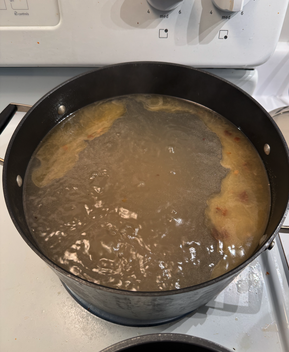 I’d always assumed making stock was a massive, not-worth-the-time effort. My outrage over the flavorless store-bought stock led me to quickly find out that this is very much not the case. And, once I actually tried making it, I could confirm this fact. For my first attempt at homemade stock ever, I kept all the bones after an outing to Harold’s (I was too cheap to find bones another way), cleaned the batter off, and boiled them for a day. The result was delicious—everything I made with it burst with rich flavor. That risotto? Slapped. As delicious as my vat of Harold’s stock was, the stock can surely be leveled up, as I’ll show you how to do. It can also be adapted for any type of meat, and different meats can be mixed and matched.