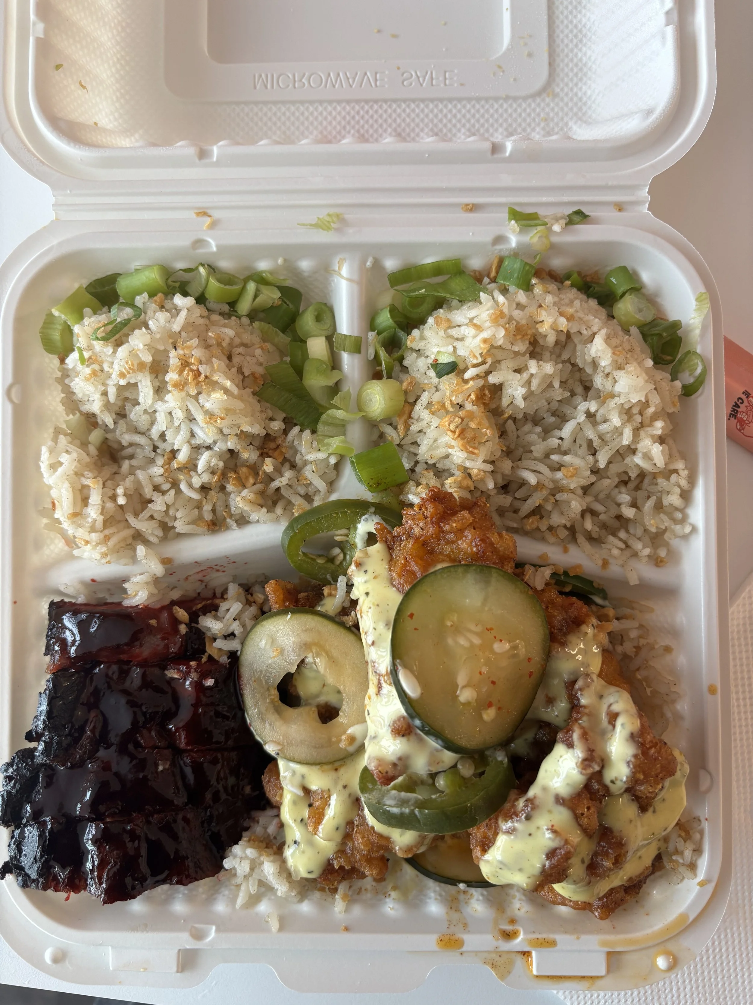 I opened the box to something of an onslaught; I found myself assaulted on three fronts. First, I was somewhat surprised to see the color of my fried chicken. Rather than the fiery red characteristic of Nashville-style fried chicken, the chicken was an intriguing yet unexpected deep golden brown. Immediately following this was the assault on my olfactory system; after popping open the top of the box, I was hit with the aroma of green onion, which was scattered liberally over the garlic butter rice. At that moment, if I had closed my eyes, I would have envisioned a steaming bowl of noodles in front of me, generously topped with green onion. The finishing blow? The puddle of orange grease which escaped the takeout container, pooling on the table.