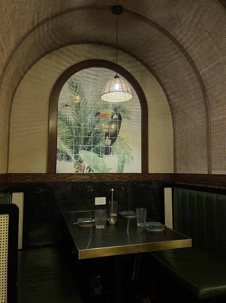 The interior features lots of greenery, almost resembling an enchanted garden. Pairing earthen tones and animal prints with gold and black diningware creates a modern, elegant feel while remaining rooted in nature.