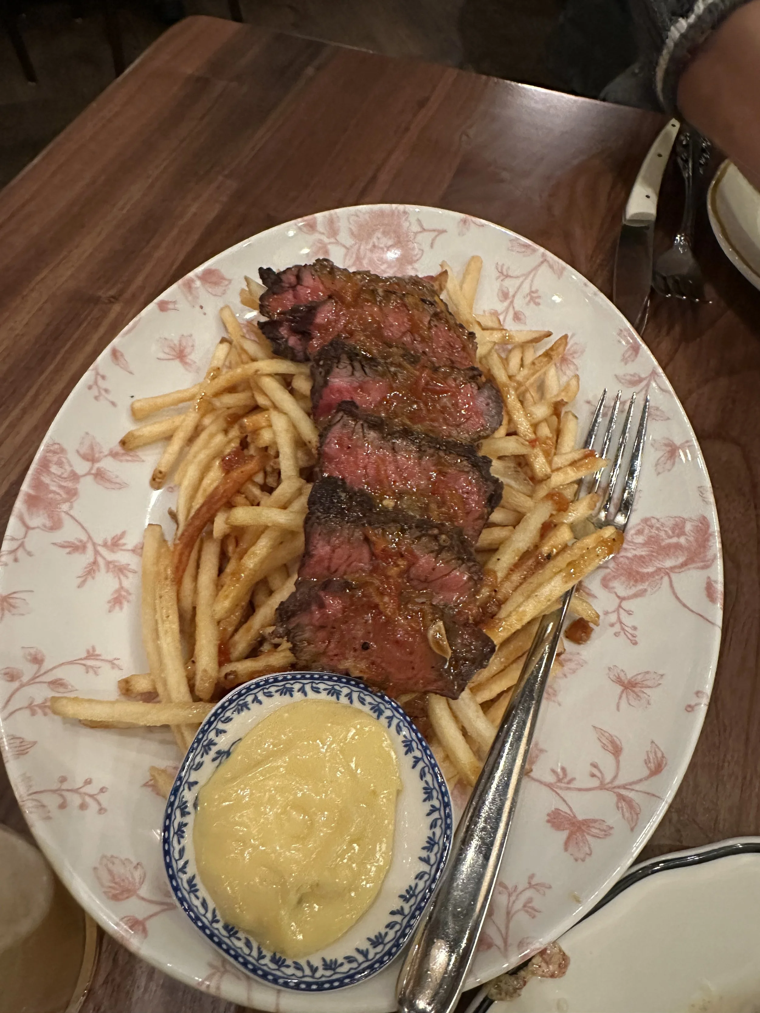 To ensure we got some protein, we ordered the bavette steak. I had gotten very full by this point in our meal, so although I love steak, I couldn’t truly appreciate it. The beef was served with a peperonata sauce, fries, and garlic aioli. I am often very picky about where people add bell peppers, and adding them to the steak was, in my opinion, a bad idea. It didn’t enhance the beef in any way. Otherwise, the meat was perfectly cooked. The shoestring fries were crispy but too salty, and the aioli ironically tasted too oily. Honestly, I would skip this dish, as there are several items on the menu that are more delicious.