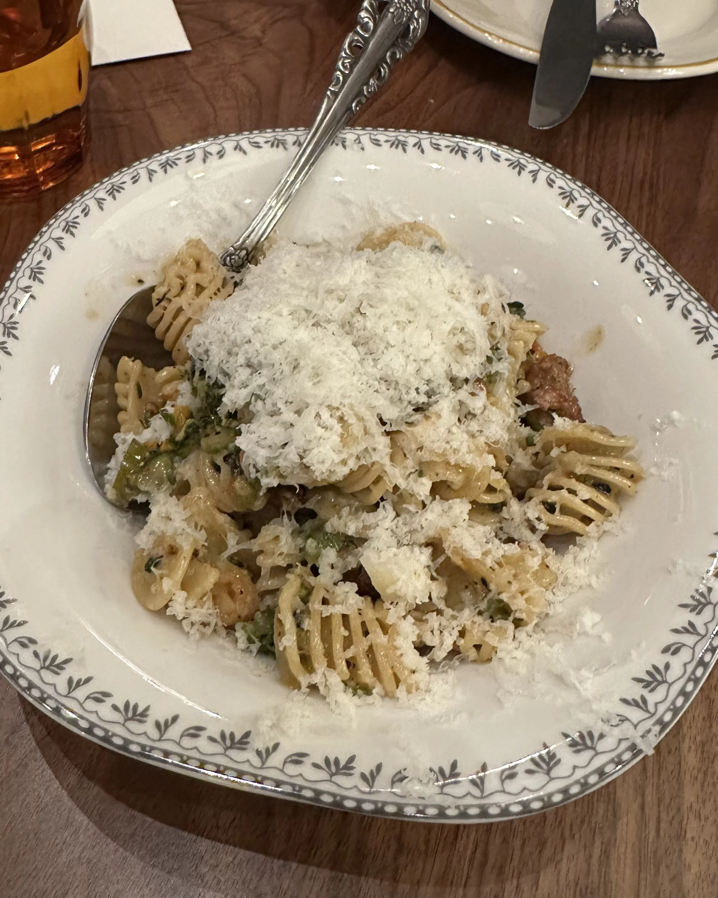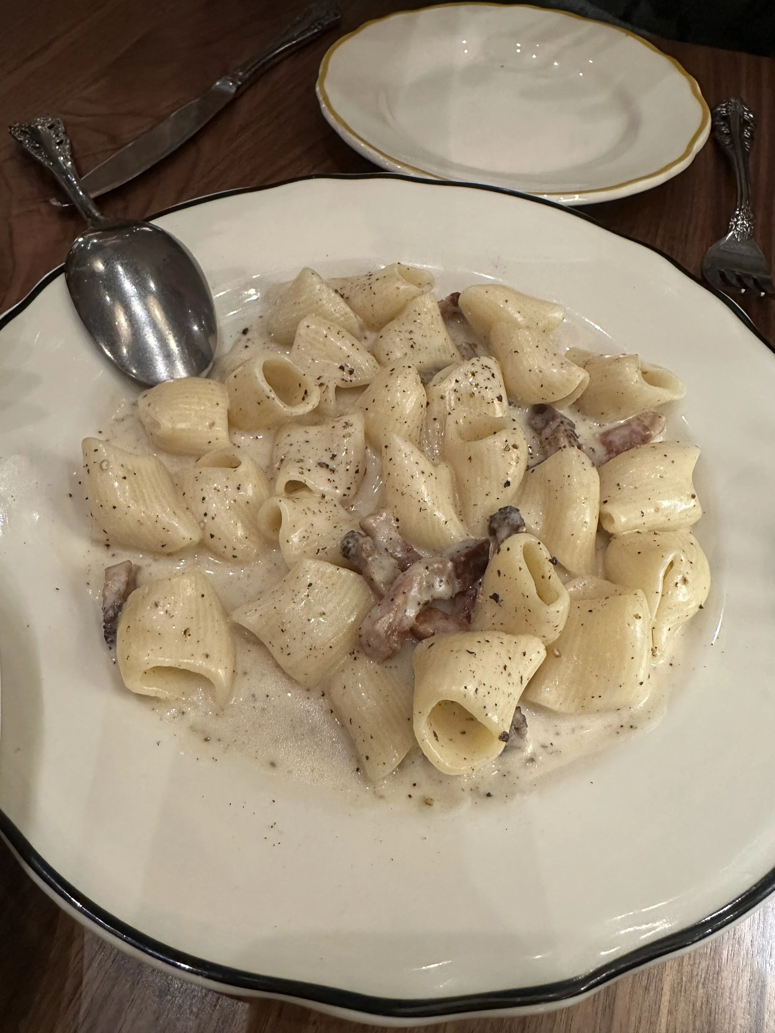 Moving on to pastas, we ordered the Radiatore and Rigatoni. The Radiatore was a sauceless pasta, similar to the idea of a pasta salad, but warm rather than cold. It was served with fennel sausage, broccolini, and freshly grated provolone. This dish was light and savory with a hint of spiciness, and it felt well-balanced with the additions of protein and vegetables. It was certainly unique and had that addictive flavor that makes your fork keep coming back to it. The rigatoni, contrasting the light pasta, was, in my opinion, a hybrid of cacio e pepe and carbonara. The perfectly al dente rigatoni was served with pecorino and black pepper sauce and guanciale. I enjoyed the rigatoni noodles more than the radiatore; however, the cheesy sauce was so sharp that it was almost overwhelming. The guanciale was delicious and added a nice texture, but I couldn’t fully enjoy it because of the sauce's sharpness. I never thought there could be such a thing as too much cheese, but in this case, I believe that if the cheese were taken down a notch, the pasta would improve doubly.